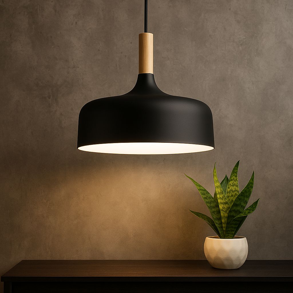 Modern Minimalist Design: The matte-black aluminum shade paired with a subtle wooden accent gives the light a refined yet understated aesthetic — ideal for contemporary, industrial, or Scandinavian interiors.
