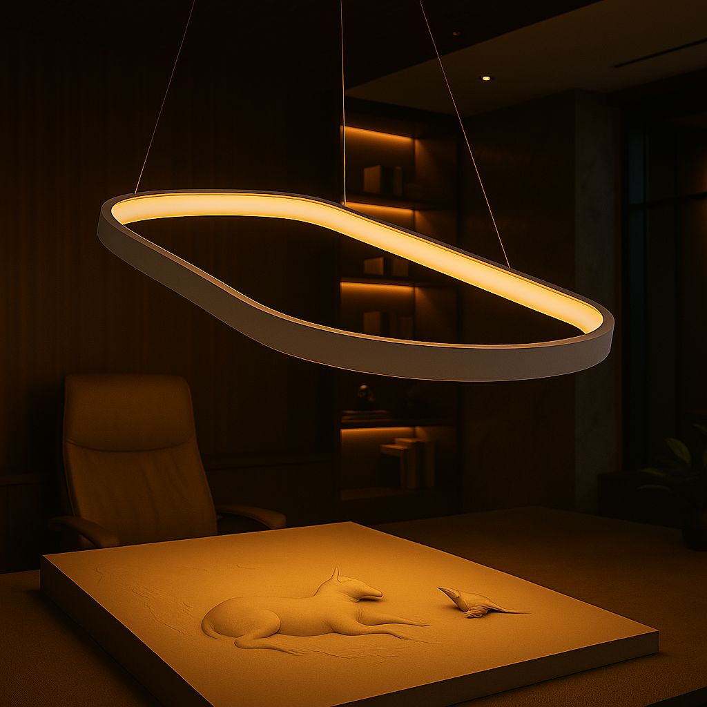Perfect for dining spaces, conference rooms, and contemporary living areas, the Éclairs light emits a soft, uniform glow that highlights architectural aesthetics while maintaining visual comfort. Its linear form and suspended elegance make it ideal for accentuating tables, workstations, and reception counters.